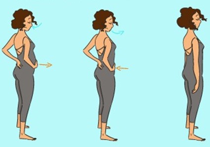 -Debout, les épaules relâchées et le dos droit, appréciez le mouvement de va-et-vient de votre abdomen en plaçant une main sur le ventre et l’autre dans le dos, au niveau des lombaires (En cas d’inconfort, vous pouvez aussi placer les deux mains côte à côte sur le ventre, les doigts face à face).